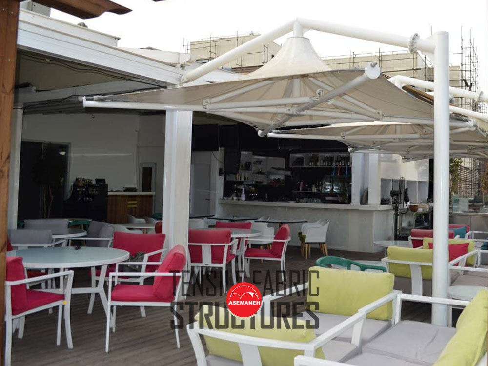 برای طراحی این سایبان تیم فنی و مهندسی شرکت آسمانه با بررسی و کارشناسی وضع موجود برآن شد تا از فرم مخروطی بهره بگیرد؛ فرم مخروطی سازه چادری با ستون جانبی برای این منظور انتخاب شد. قرار گرفتن ستون باعث محدود شدن چیدمان مبلمان میشود بنابراین انتخاب فرمی با ستونهای جانبی رضایت کارفرما را برآورده میکند. برشهای منظم پارچه که از زیر سقف برای افراد قابل رویت است زیبایی سازه غشایی را دوچندان میکند. در نهایت با ایجاد 3 سازه غشایی 9 مترمربعی کار طراحی انجام شد.