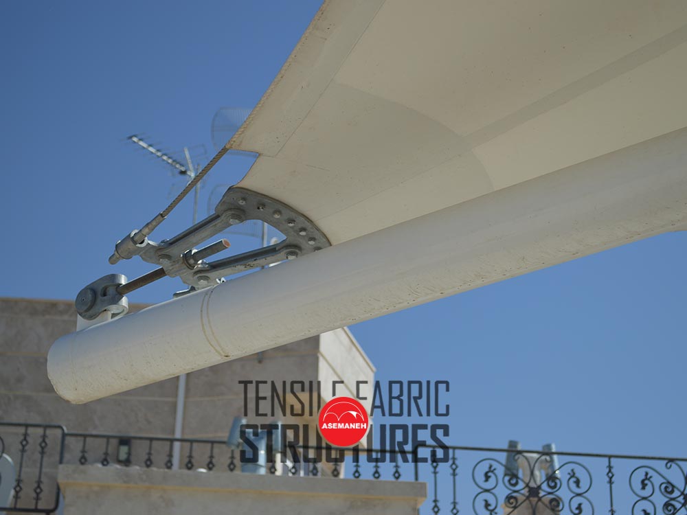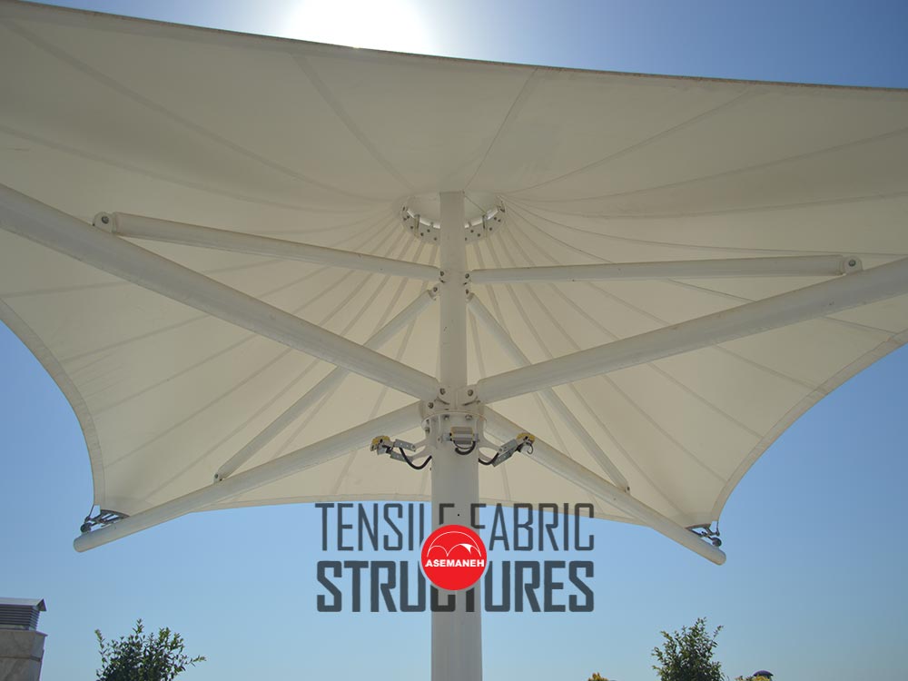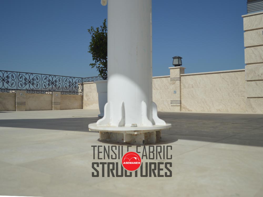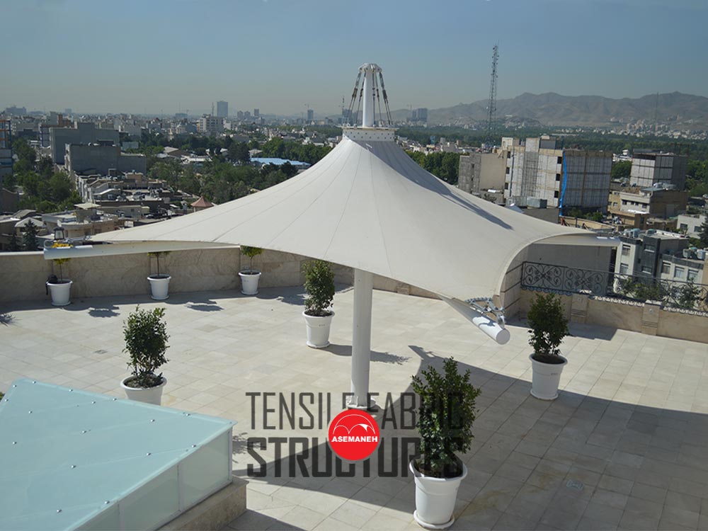 آلاچیق چادری روف گاردن خیابان بزرگمهر 12 مشهد با توجه به نظر کارفرما مبنی بر استفاده حداقلی از عضو فولادی در زیر سقف، تیم فنی و مهندسی آسمانه را بر آن داشت که از فرم مخروطی شکل سازه کششی استفاده کند.